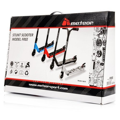 Hulajnoga wyczynowa 22779 renomowanej marki METEOR, została wykonana z najwyższej jakości aluminium, dzięki czemu charakteryzuje się trwałością i lekkością. Wszystkie śruby które znajdują się w hulajnodze 22779 wykonane są ze stali, gwarantuje to bardzo dużą wytrzymałość połączeń. Kierownica posiada gumowe rączki, które zapewniają pewność uchwytu. Kierownica obraca się 360 stopni. Dodatkowo pojazd posiada błotnik, który ochrania przed ochlapaniem. Błotnik jednocześnie służy jako wygodny hamulec. Unikalna konstrukcja i wysokiej jakości wykonanie zadowolą najbardziej wymagających użytkowników. Hulajnoga 22779 świetnie nadaje się jako prezent.