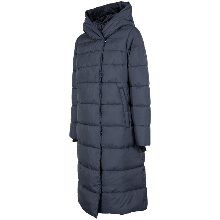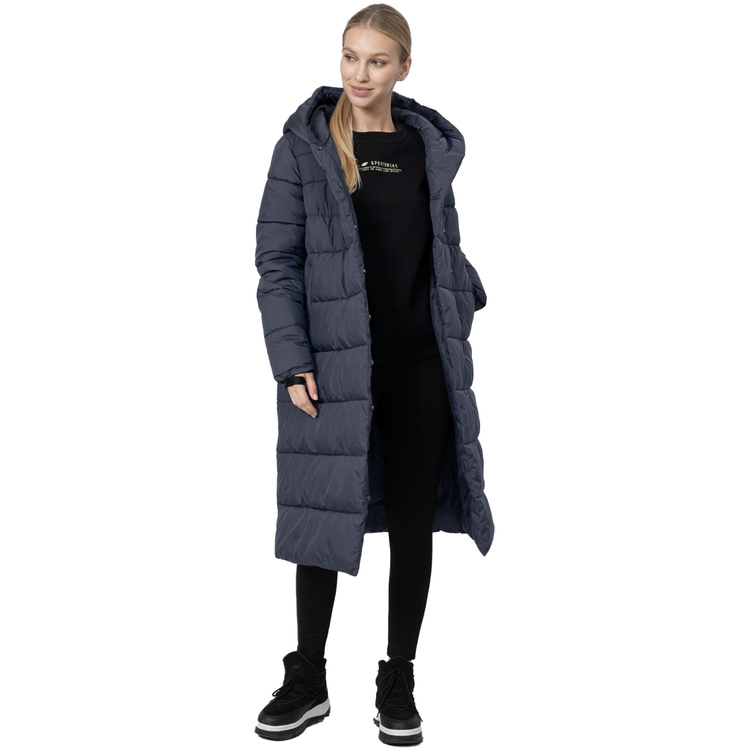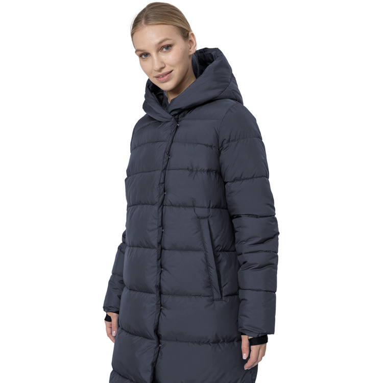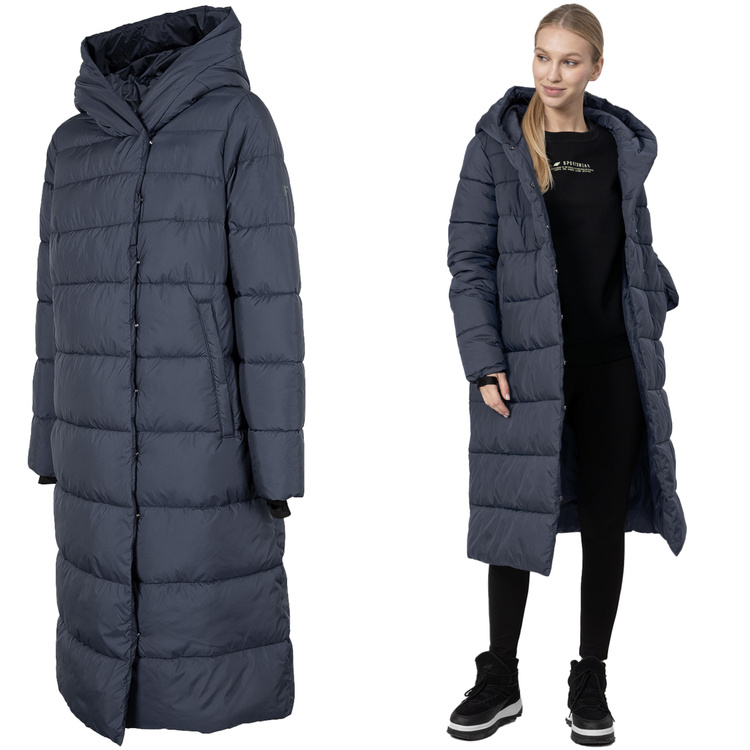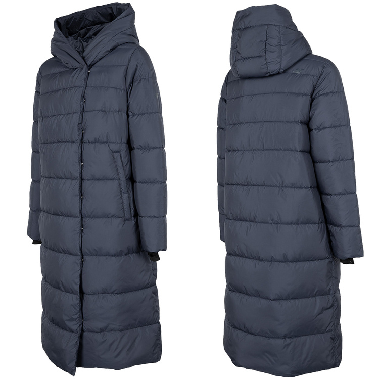Damski płaszcz puchowy marki 4F to idealny wybór na chłodne i wietrzne dni. Starannie wykonany z nowoczesnym pikowaniem, co dodaje jej sportowego charakteru. Płaszcz ma długi krój co wesprze komfort termiczny i zapewni ciepło. Kurtka wypełniona lekkim i puszystym puchem syntetycznym, który zapewnia komfort cieplny. Dodatkowo szybko wysycha i jest odporna na pleśń. Nawet po kontakcie z wilgocią płaszcz nie traci funkcji izolacyjnych.
